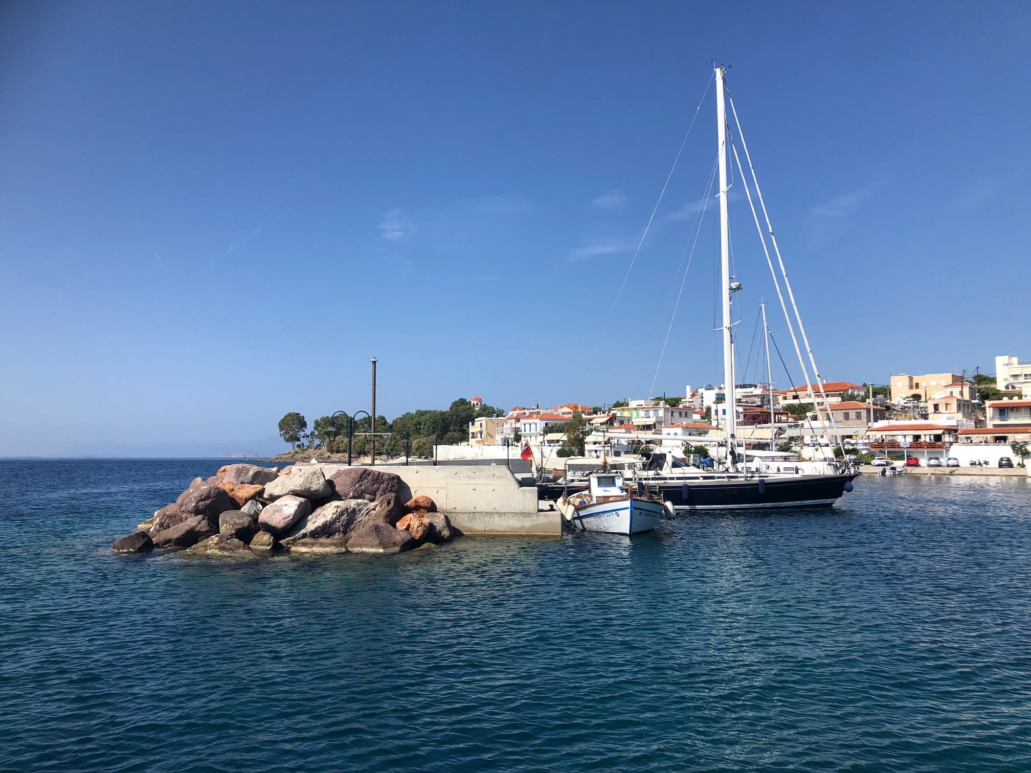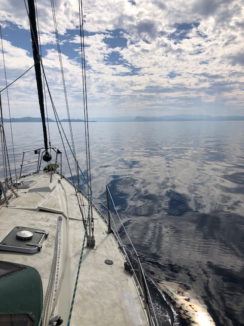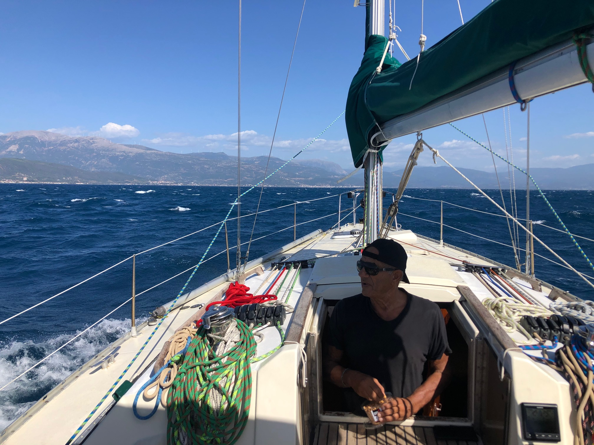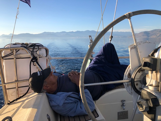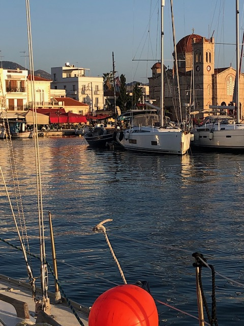 Eh bien non. On navigue avec le Vent… enfin on essaye, et une idée plus ou moins précise d’un timing global. Cela diffère beaucoup d’un individu à l’autre. Assez flou dans mon cas; mais présent. Dernière baignade à Sptetsès dans une eau en dessous de 24 (oui je sais je fais mon délicat): l’automne arrive, et ce n’est pas un mythe grec. Pour l’instant le vent est sud, sud-ouest, ou absent, selon la position de l’anticyclone, il finira par passer nord, amenant du froid ou du gros temps qui sait