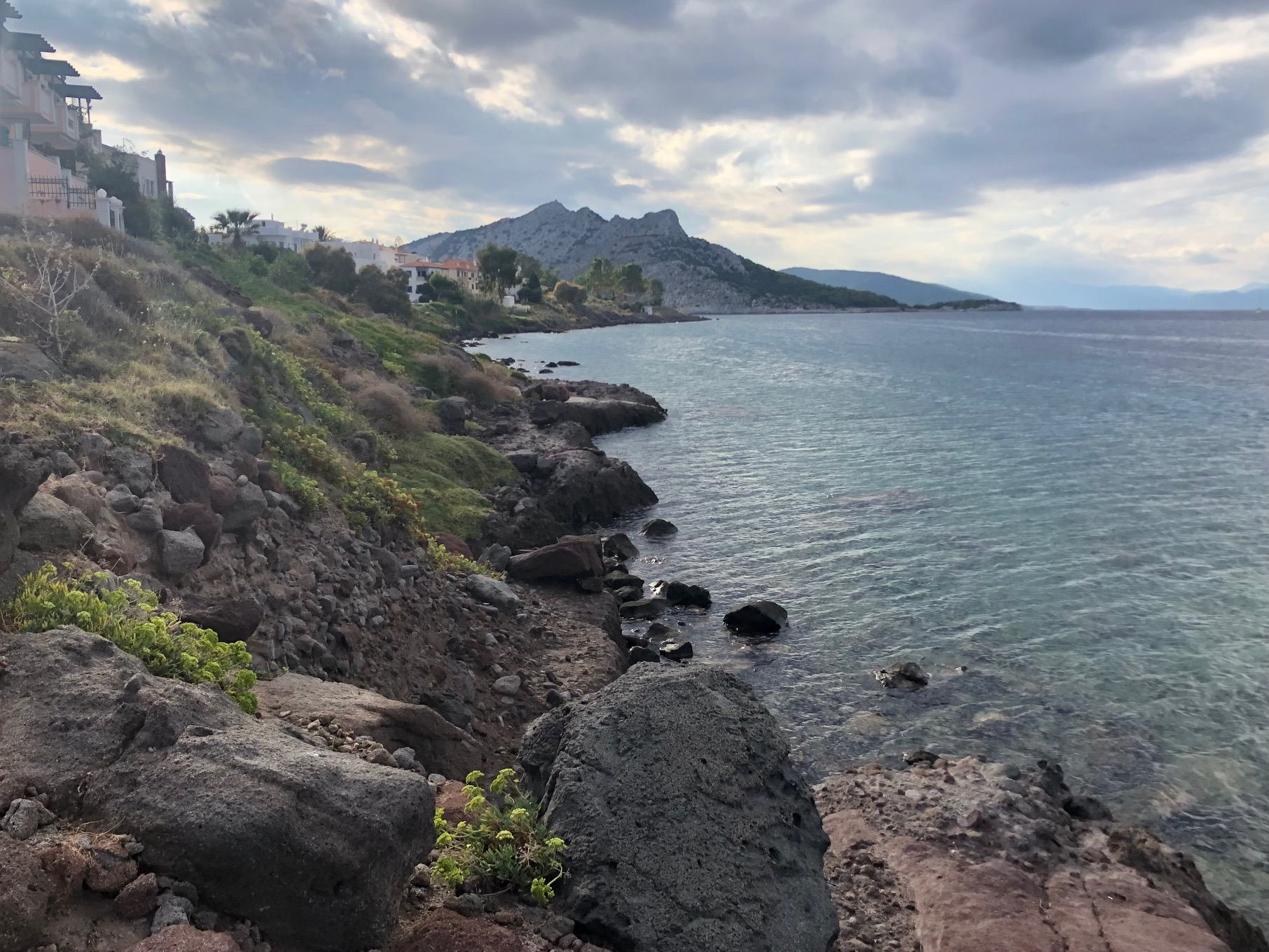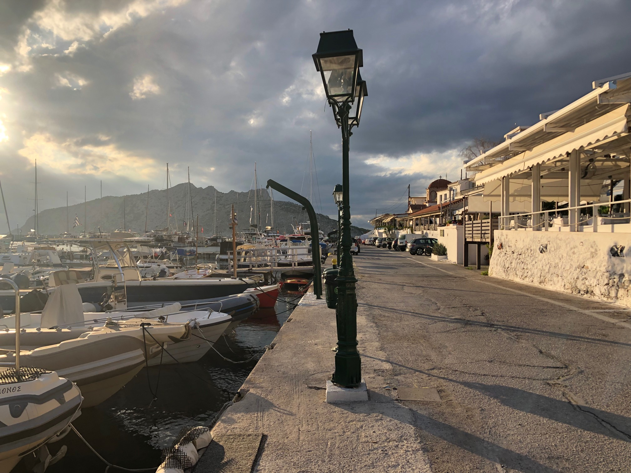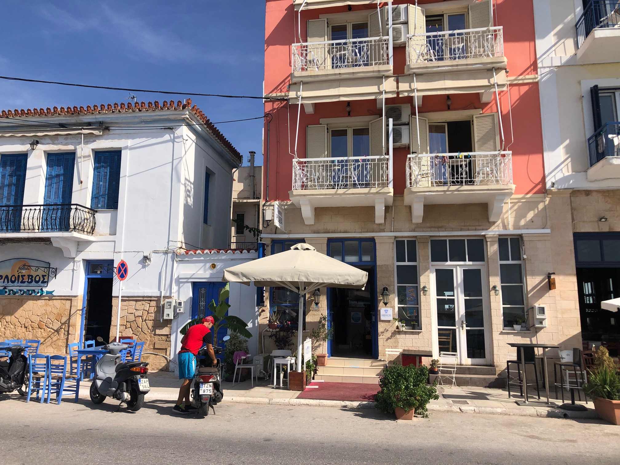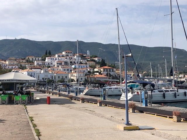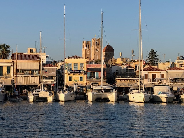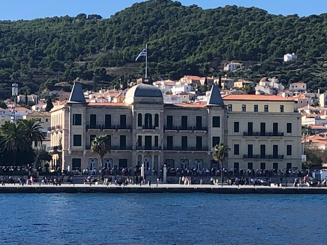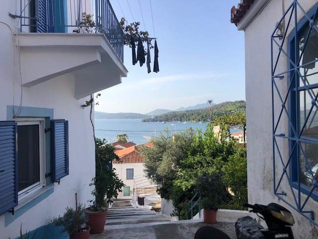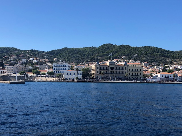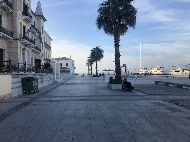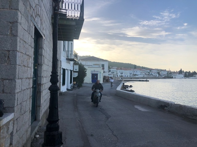 Si Hydra m’a séduit d’emblée, Spetsès non. Je suppose que la ville gagne à être connue et qu’il fait bon y vivre, y avoir des amis, des habitudes. Y trouver ses marques. J’y ai aimé ce balcon immense sur la mer avec le continent en face, la luminosité du soir, cette sorte de vie au ralenti qui semble y animer chacun, autochtone ou touriste, jeune ou vieux. Moins ce défilé perpétuel de scooters dont le seul but semble d’aller chercher plus loin ce qu’on cherchait ici.