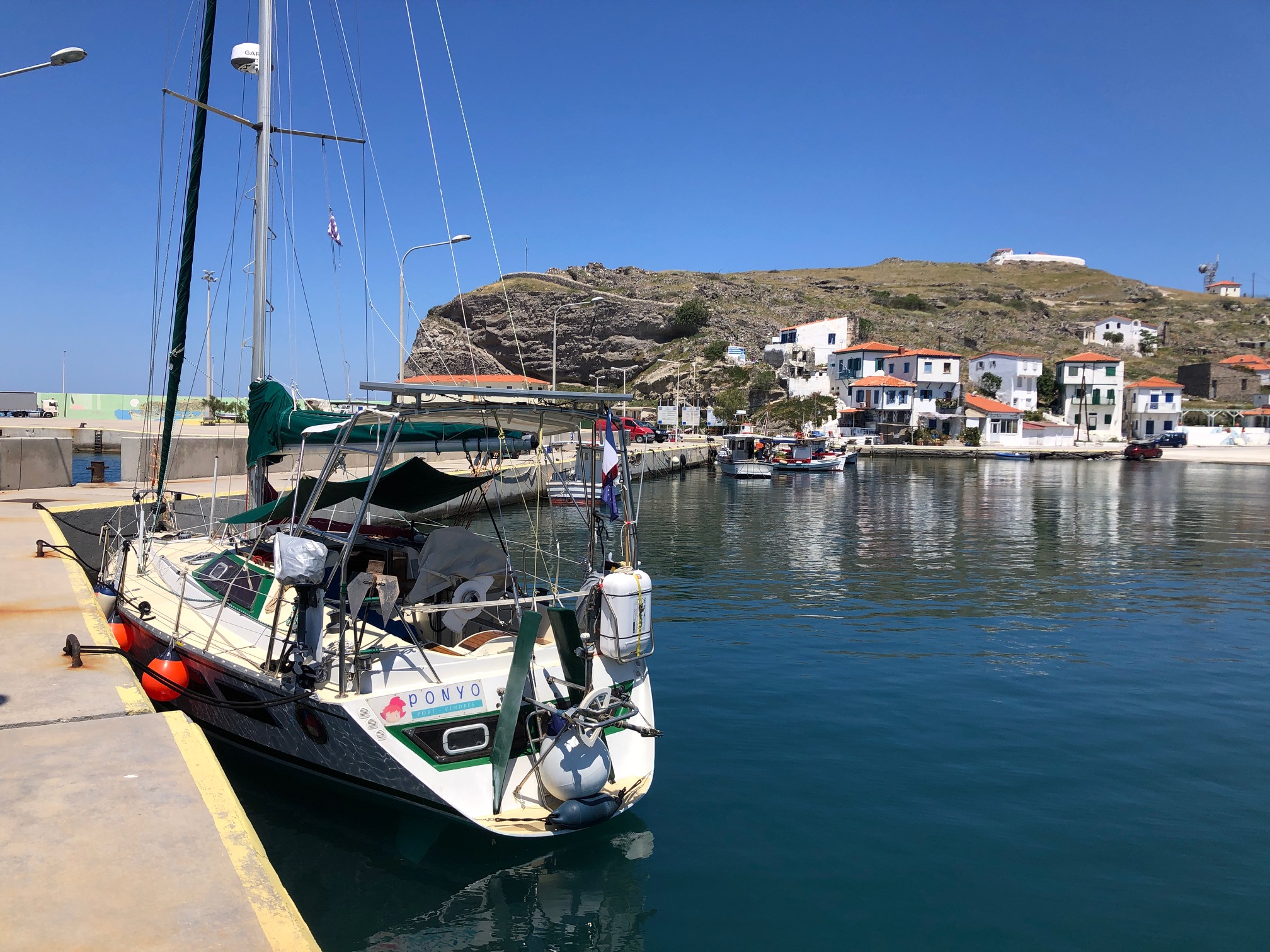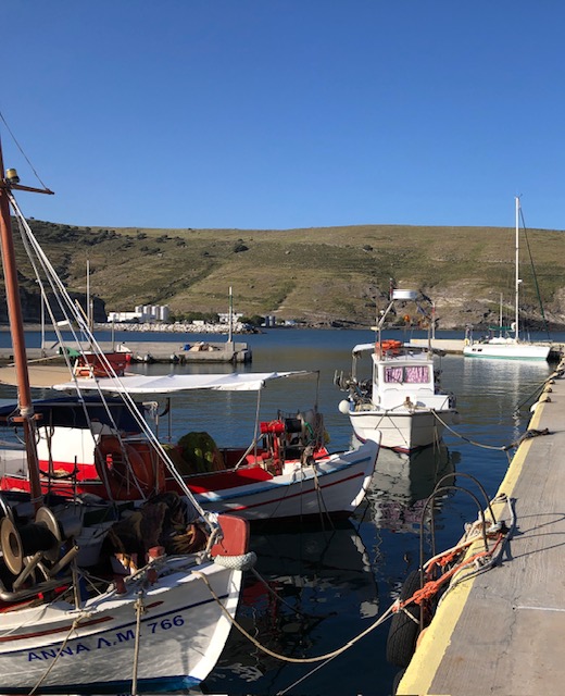 J’y arrive le Vendredi-Saint. Tout est fermé. J’ai choisi de mouiller dans le petit port de VOTSI, à l’Est de celui de PATITIRI, la ‘capitale’. Mini port où l’on doit s’ancrer en portant une longue amarre à terre, il n’y a pas de place pour ‘éviter’ (tourner avec le vent autour de son ancre). Immobiliser le bateau, mouiller, calculer la distance à la falaise, gonfler l’annexe, charger l’aussière flottante, l’attacher à un rocher, retourner à bord, ‘wincher’ l’aussière jusqu’à ce que le bateau soit perpendiculaire à la falaise. Idéalement il en faudrait deux… Je me dis que je ne suis pas doué, et surtout très lent. Mais un Dufour grec arrive le soir avec plusieurs équipiers et leur amarrage dure jusqu’à la nuit, annexe et lampe frontale…
