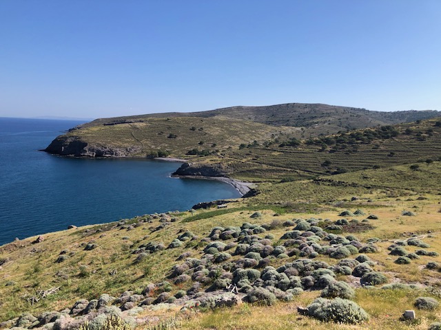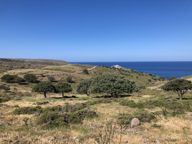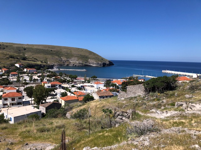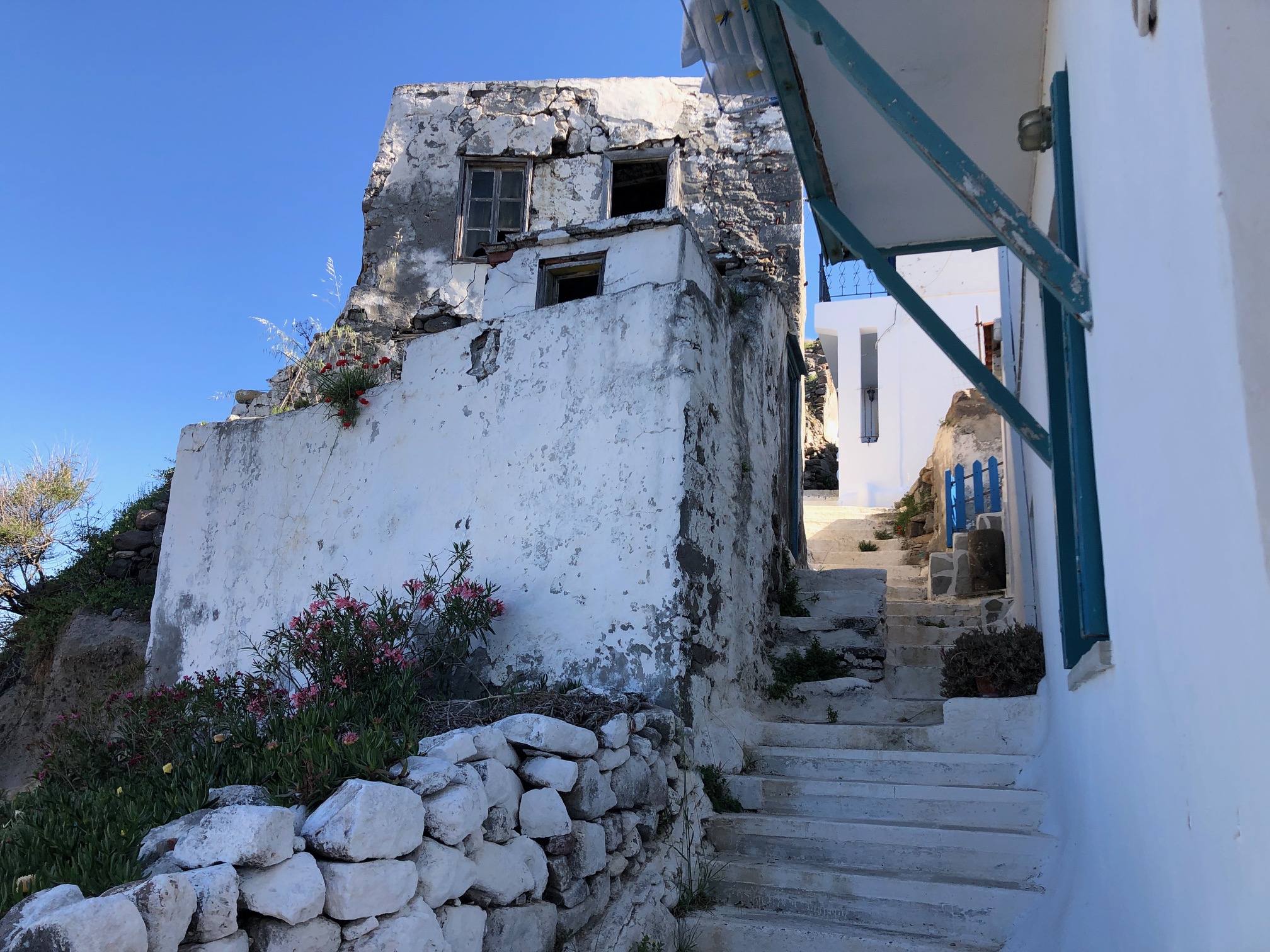 Et je me laisse gagner peu à peu par le charme de l’île. Cette île est belle! Je découvre une campagne boisée, des vergers, des oliveraies, des poulaillers, des maisons qui doivent être agréables à vivre… et j’arrive à la Chora. Pour la descente on verra bien… plus tard. Le vieux village n’est pas si vieux; ou alors tout en haut. Nombreuses maisons, un peu carte-postale mais jolies, terrasses, ombrages, vieux arbres, chemins empierrés. En haut quelques vieilles habitations, petites, couleur pierre, qui me rappellent certains hameaux de chez moi, dans l’Aude. Point de vue sur les deux côtes Ouest et Est impressionnant. Mais TOUT est désert. Cela ne vit QUE pendant les vacances. Le touriste repart, la vie s’arrête.