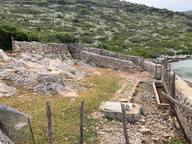 4 heures de marche dans le vent sur les hauteurs; quatre heures de bonheur! La population de l’île, 150 personnes environ, est concentrée dans le port. Quelques fermes dispersées comme celle d’Odysseas et Antonia, qui arrêtent leur pick-up à notre hauteur quand nous redescendons; à l’arrière, des bidons de lait de brebis qu’ils apportent au bourg pour la fêta. Travail, vie rude, solitude, rêve d’une existence plus facile. Vu de notre côté gens bien vivants, lumineux et amicaux. Mais qui de nous supporterait leur mode de vie sur ces hauteurs, dans cette petite île au milieu de la mer Egée, malgré le Ferry, internet peut-être, et le soutien sympathique de cette petite communauté d’EFSTRATIOS?
